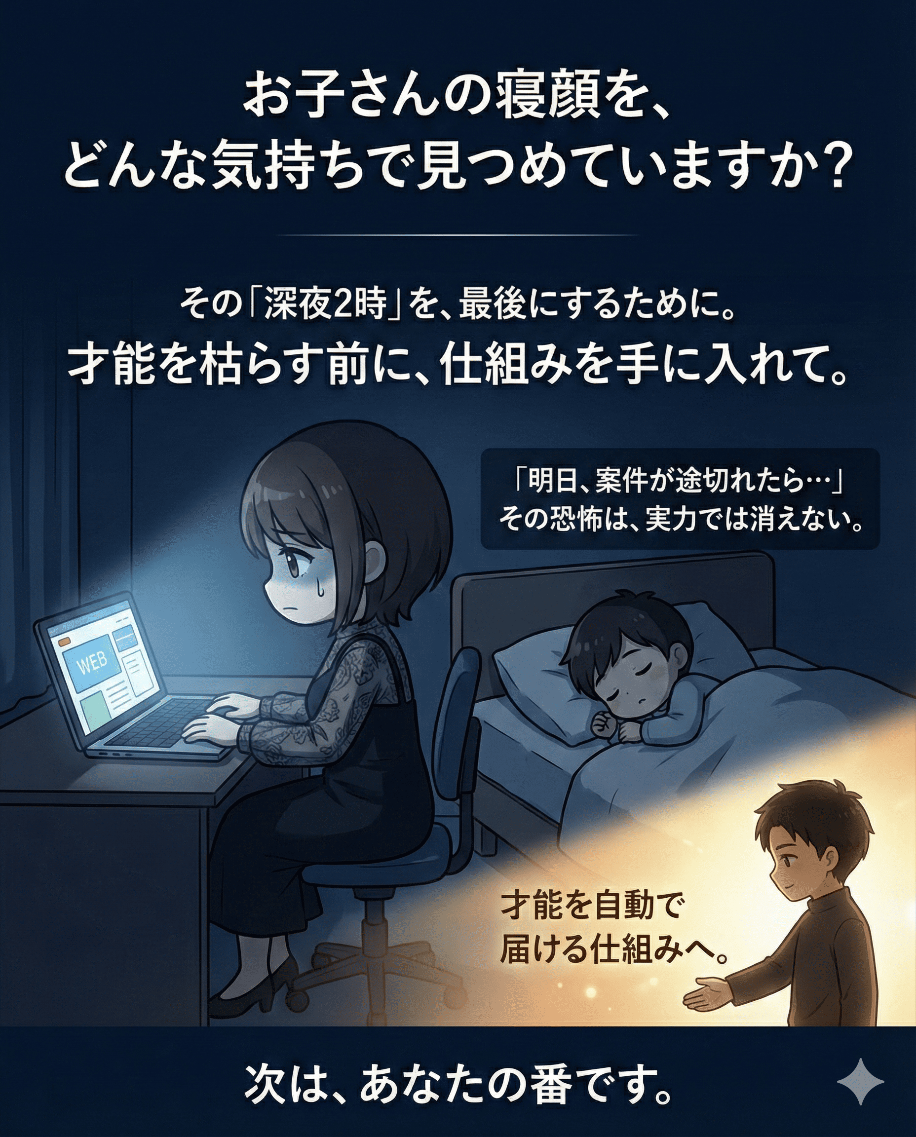 深夜2時、静まり返った部屋で青白い画面に向き合いながら、ふと横で眠るお子さんの顔を見て、胸が締め付けられることはありませんか?
