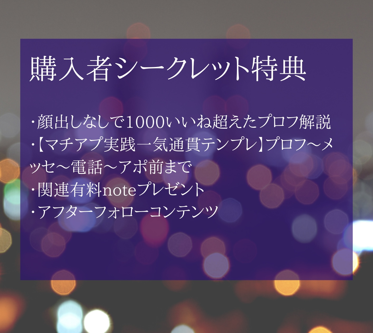 シークレット特典。顔出しなしでいいね数1000を超えたプロフ原文紹介します。その他お役立ちまとめとしてプロフ・メッセ・電話・アポなどトータルでかゆいところに手が届くものを用意しています。