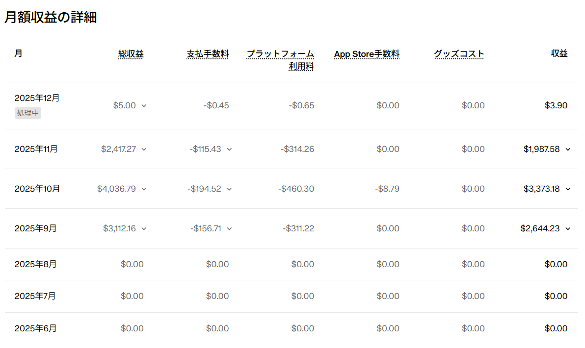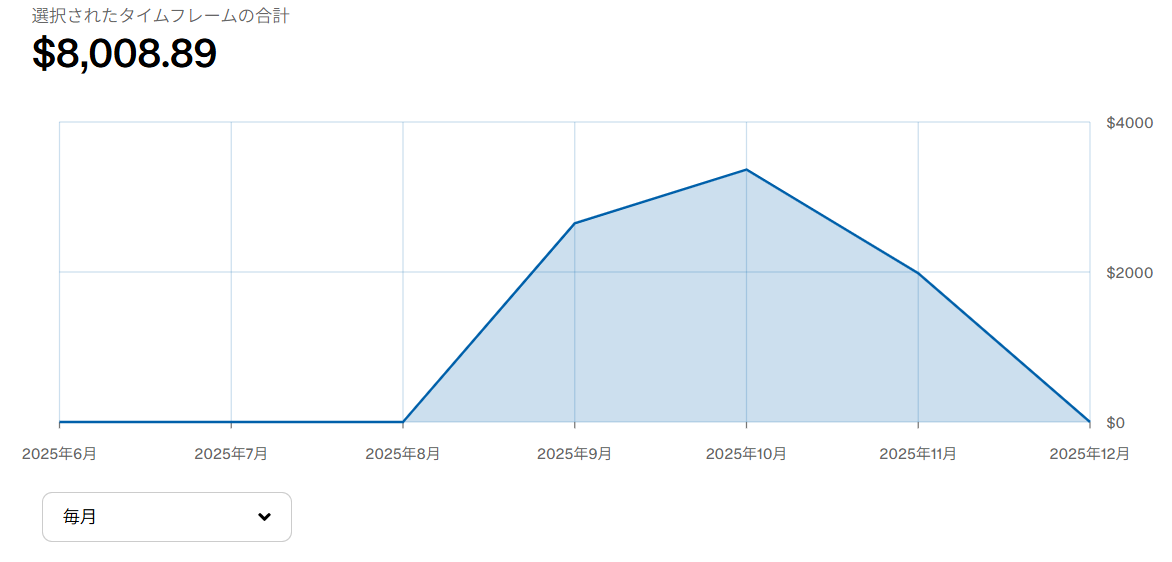 見ての通り、2025年9月から急激に伸びて、10月には$4,036(約60万円)のピークを迎えました。
