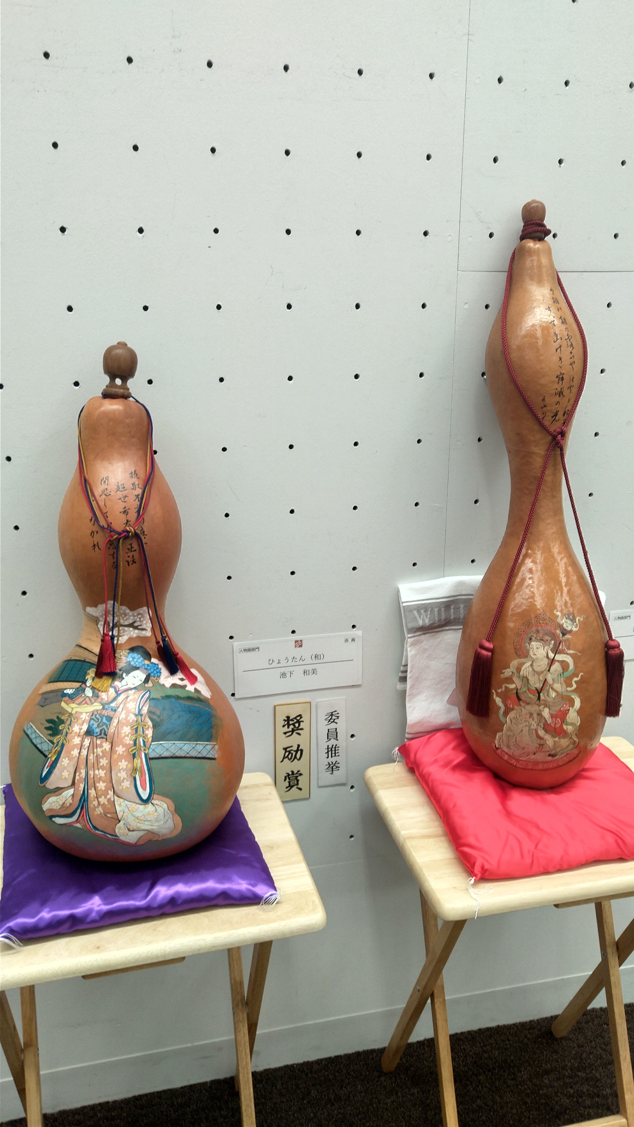 《当日会場にて、アートとのコラボ企画を実施しました.》本選会の会場にて、アーティストによるパープルリボンを描いた瓢箪作品、他を展示し、演奏ステージに独特な雰囲気を添えました。来場された方々は、休憩・交流の時間に、興味深そうに鑑賞されていました。