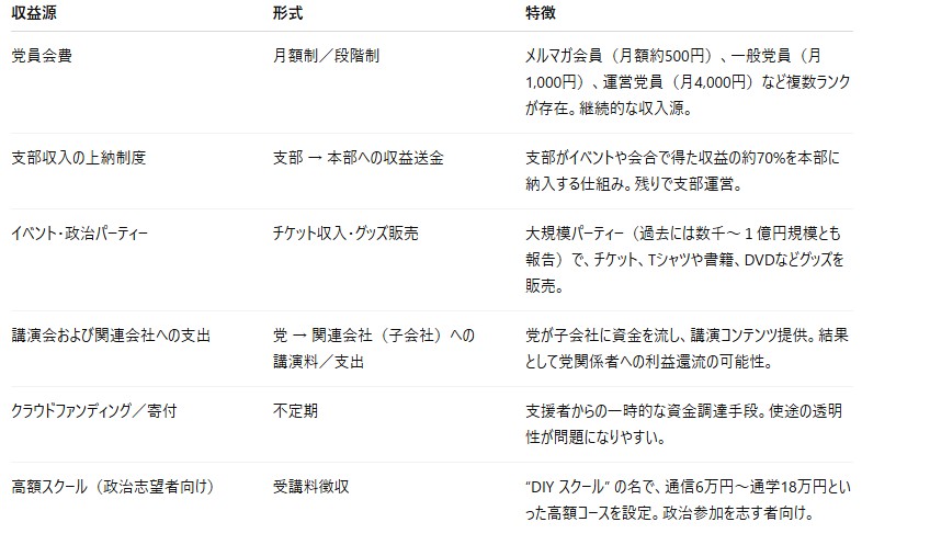 下表は、参政党が現在報告または示唆している収益源をまとめたものだ。