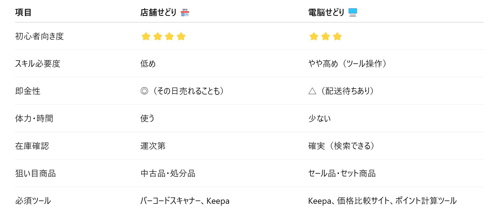 ⚖️ 店舗せどり vs 電脳せどり 比較表📝