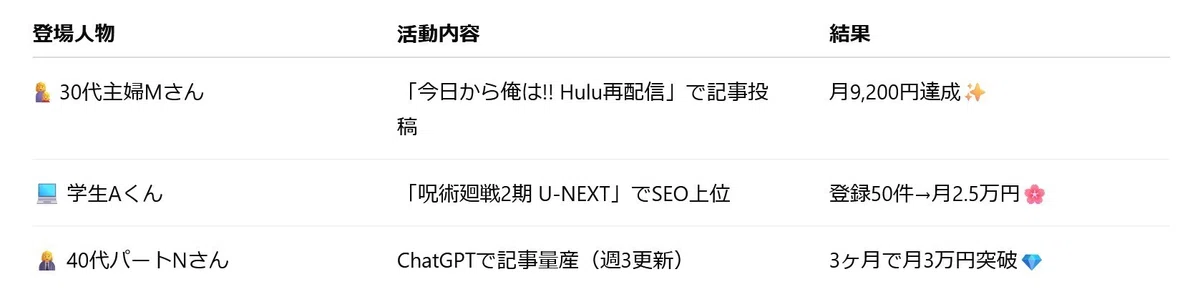🌸月5万円〜10万円:中級者帯(半年〜)→ Hulu・ABEMAなど複数案件を扱い、SEO安定✨
