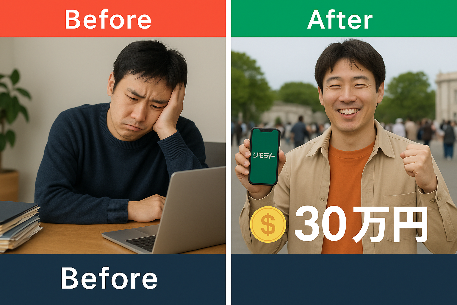 つまり、ジモティを使うか使わないかで、同じ作業でも「赤字副業」か「黒字副業」かが決まるのです。💥 ジモティせどり実践者のビフォーアフター🎭 Before:稼げない日々、在庫の山、時間の無駄…