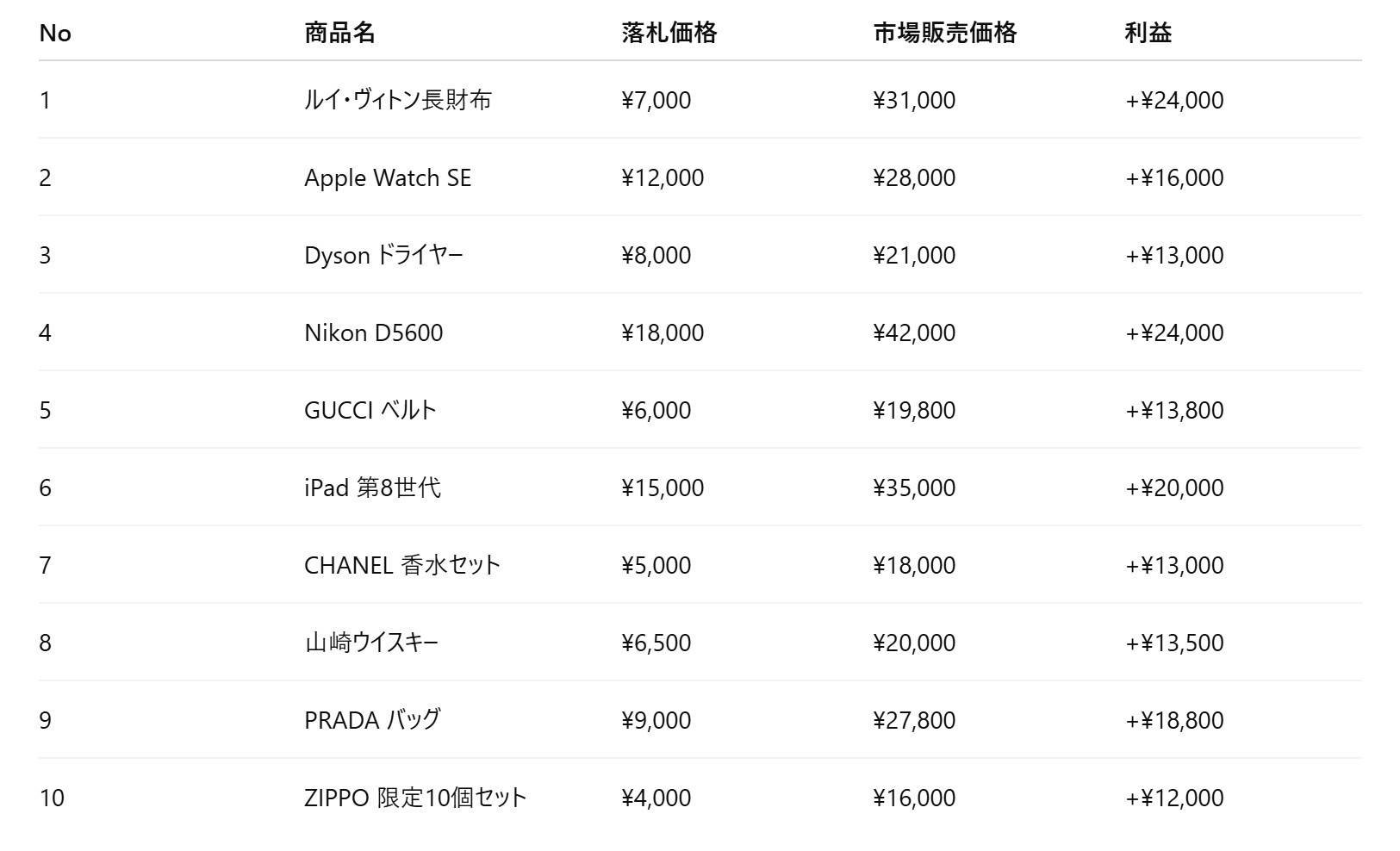 2️⃣ 実際の落札・販売データ10例 → 仕入れ→販売→利益の流れを“実例で可視化”