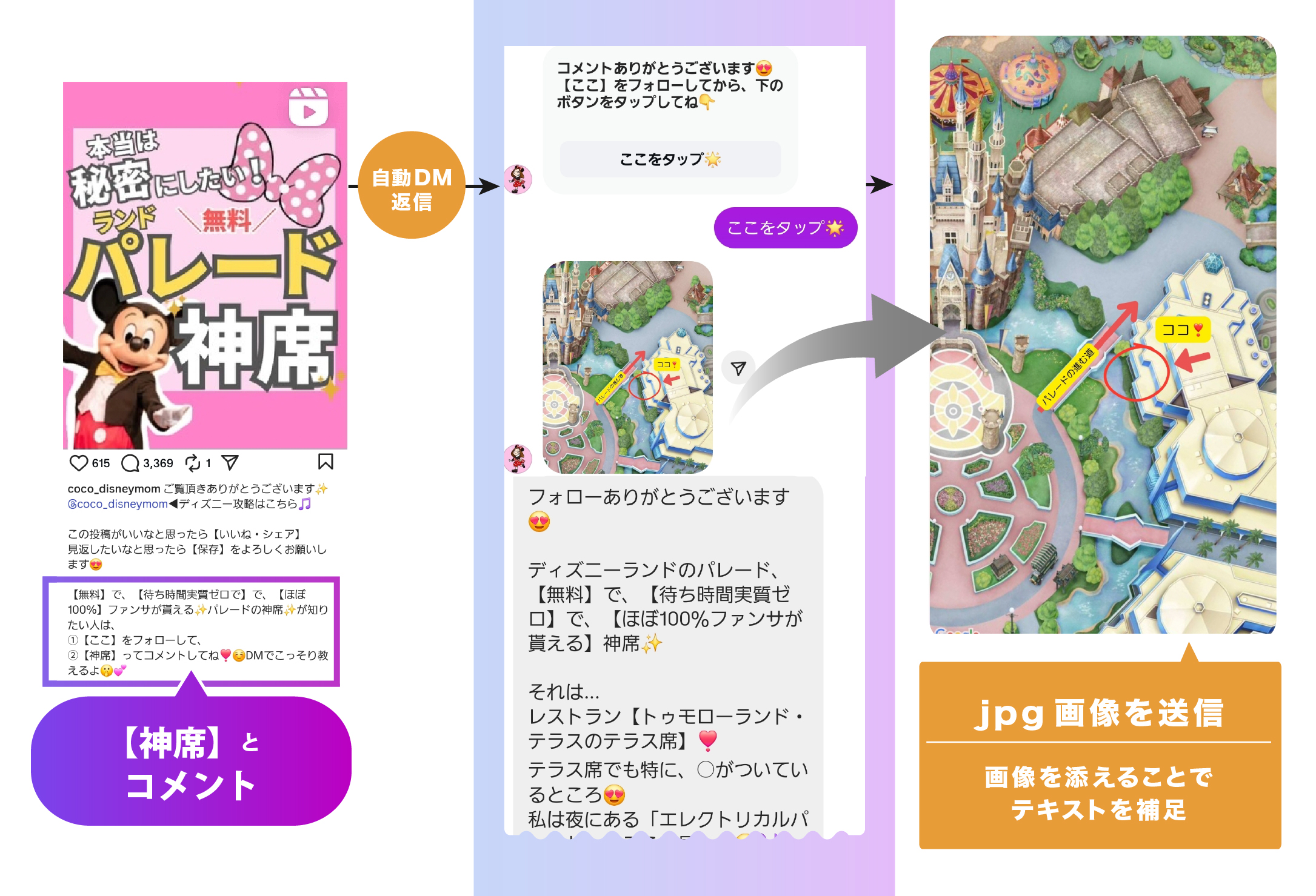 ディズニー攻略情報は、文字だけでは伝わりにくい場面も多いことから、画像や動画を自動送信するメディア応答機能を活用。パレードの“神席”MAPを自動で送信することで、「わかりやすい!」とフォロワーから好評を得ました。