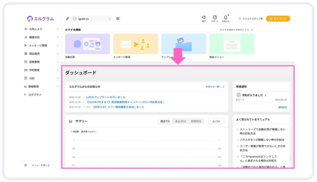 株式会社ミショナ(本社:福岡県福岡市、代表:鈴木隆宏)は、2026年1月29日(木)に実施したエルグラムのアップデートにより、ダッシュボードを追加しました。