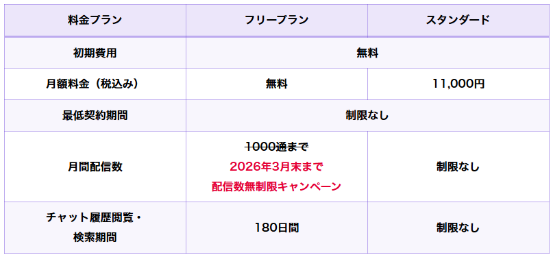 ※2026年4月以降、フリープランの月間配信数は1000通までとなる予定です。