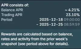 - Trading APR(取引利回り): 上記の残高利回りに加え、取引量に応じて追加の報酬が付与されます。同期間の例では、23.10%という高いAPRが設定されており、アクティブなトレーダーほど多くのリワードを獲得できる仕組みです。