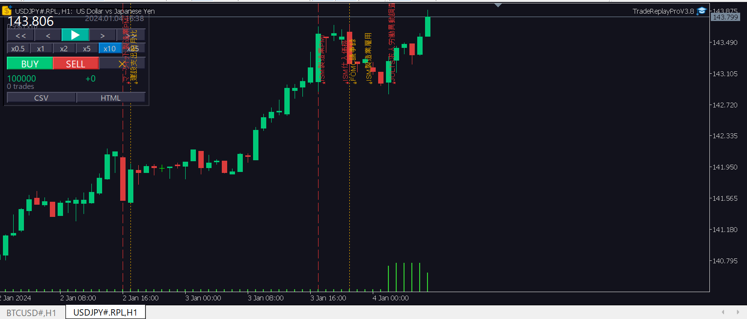 ◆ チャートリプレイ再生 指定した期間の過去チャートを、ローソク足1本ずつ、あるいはサブティック単位で滑らかに再生します。速度は6段階(x0.5〜x25)。スペースキーで再生/一時停止、矢印キーで1ステップずつ進める・戻すことも可能。