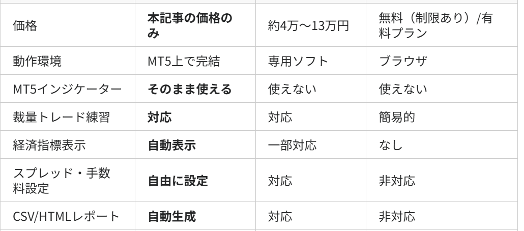 「Forex Testerは高すぎる(4万円〜13万円)」 「TradingViewのリプレイは無料プランだと制限がきつい」 「別ソフトを立ち上げるのが面倒で、結局やらなくなる」 「MT5のストラテジーテスターは裁量練習には使いにくい」