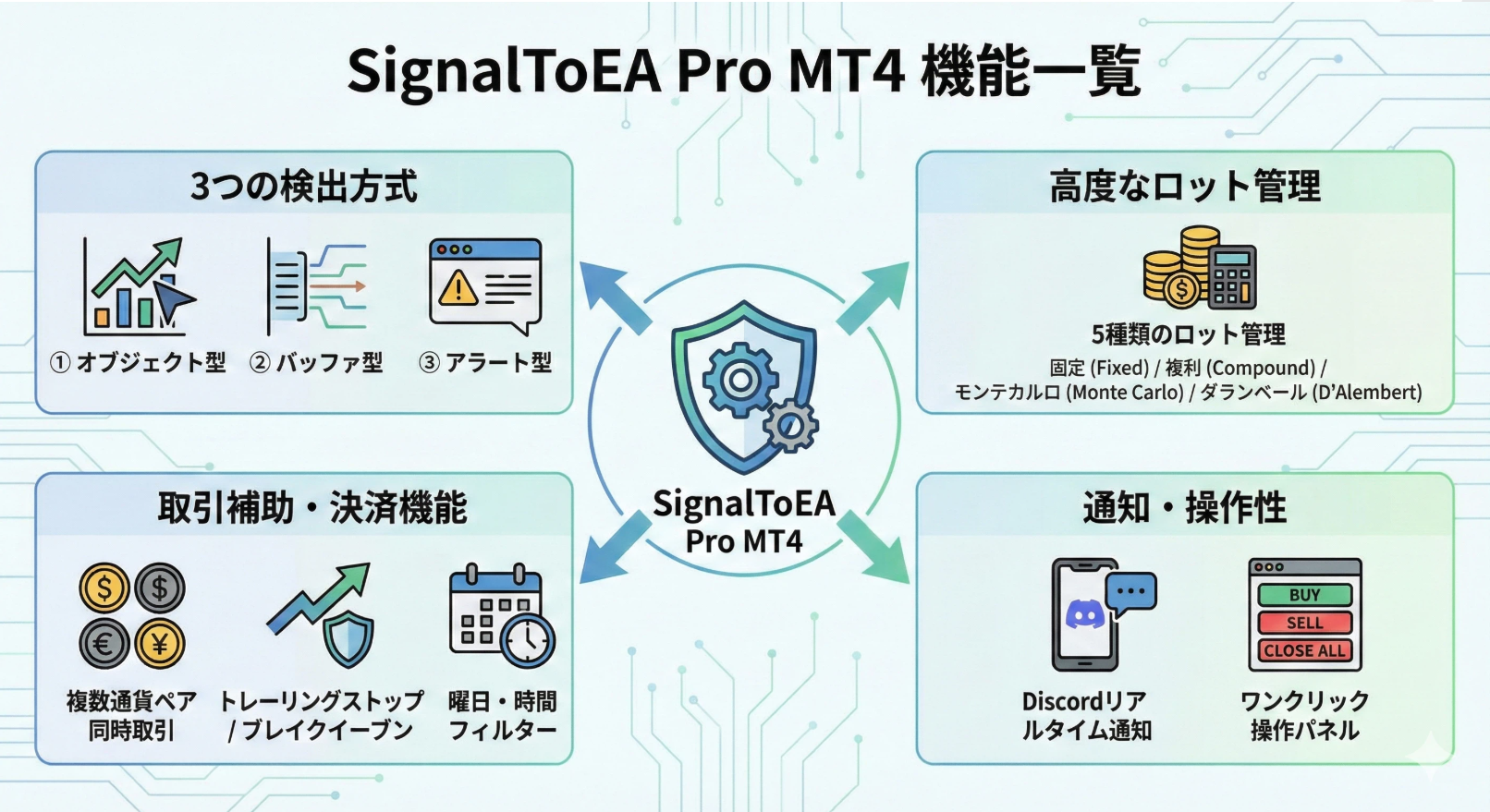 スプレッドが広がった時に止めてくれるフィルター。曜日・時間帯ごとに取引を制限する機能。連敗した時にロットを自動調整するロジック。Discord通知で外出先からでも状況を把握できる仕組み。