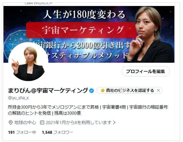 - Xでは「謎の宇宙マーケティング理論」を唱える異端児として