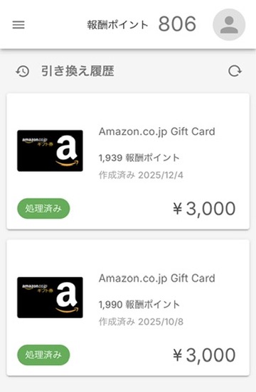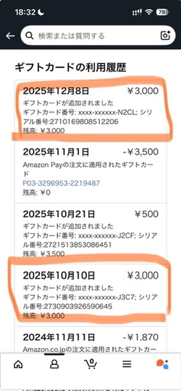 ・2025年12月8日 ギフトコードが発行され、Amazonに3000円登録できた(合計6000円)