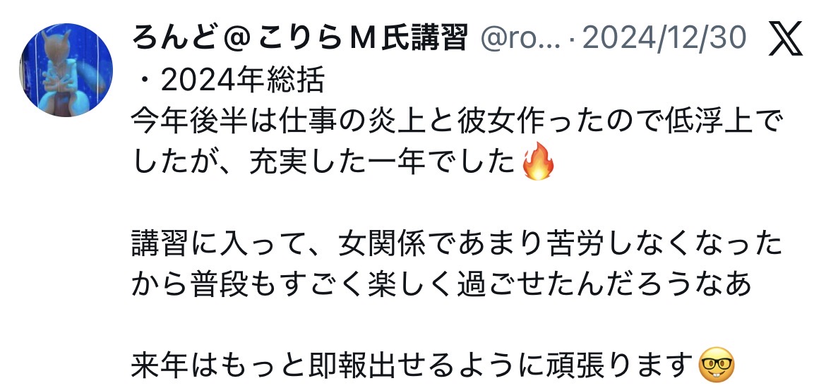他にも吃音症持ちの講習生に彼女を作らせたり、人生で一度も彼女が出来たことがなかった方にたった1ヶ月半で彼女を作られたりも。他の講習では結果が出なかったのに今では女性に困らなくなったようです。