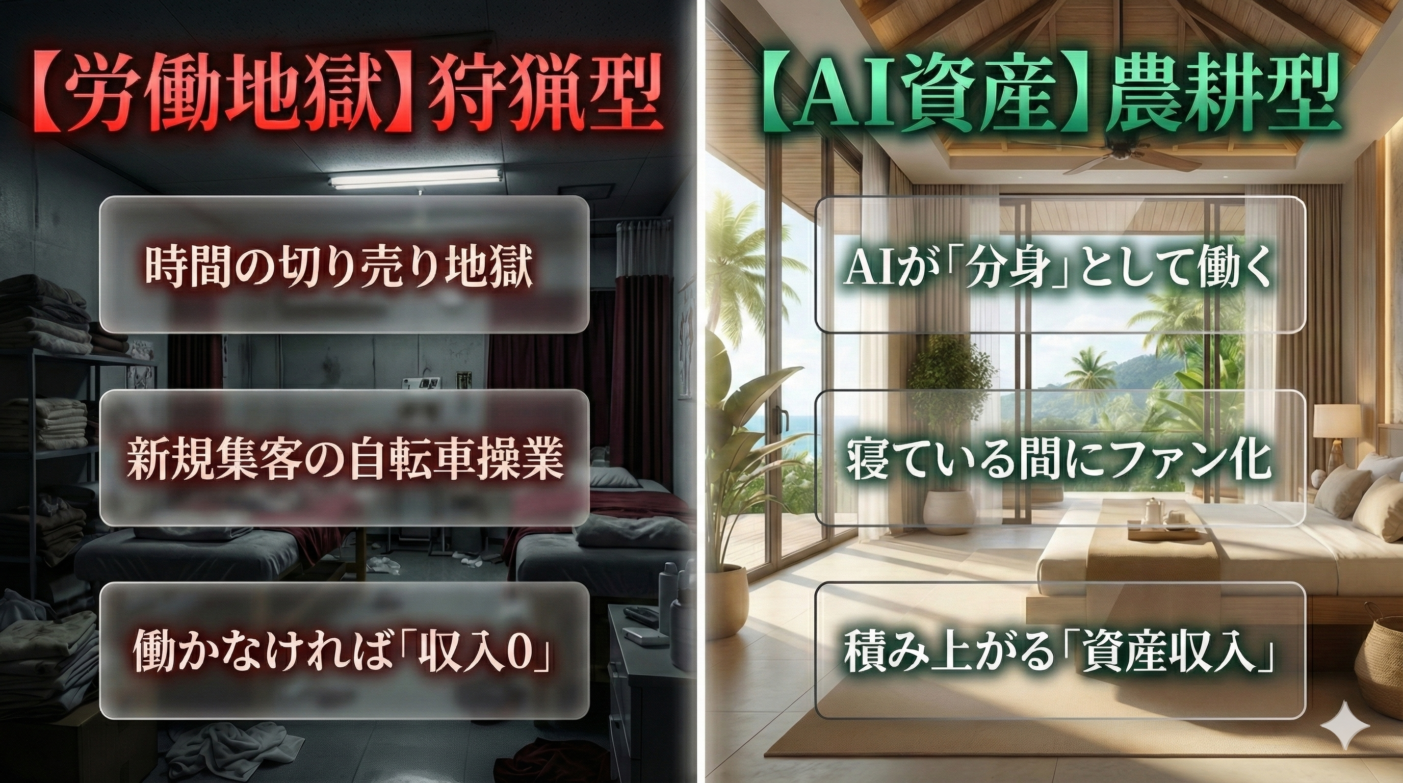 この教材がやるのは、あなたの働き方を「狩猟型 → 農耕型」に変えることです。