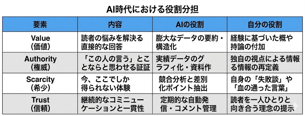 これらの失敗に共通するのは、「自分にしか出せない価値(Unique Value)」と「AIによる圧倒的効率化」のバランスを完全に間違えているという点です。