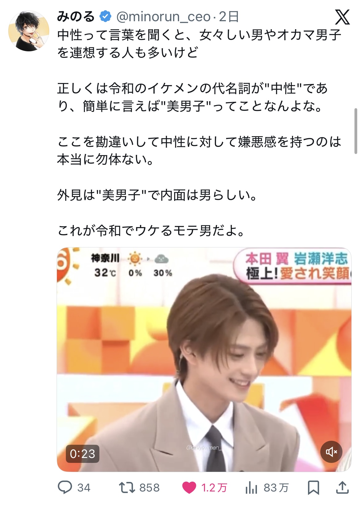 今後、中性系の発信者は増えると予想されますが、女性ウケが良いロールモデルを見極めるセンスが僕より優れている人は出てこないでしょう。