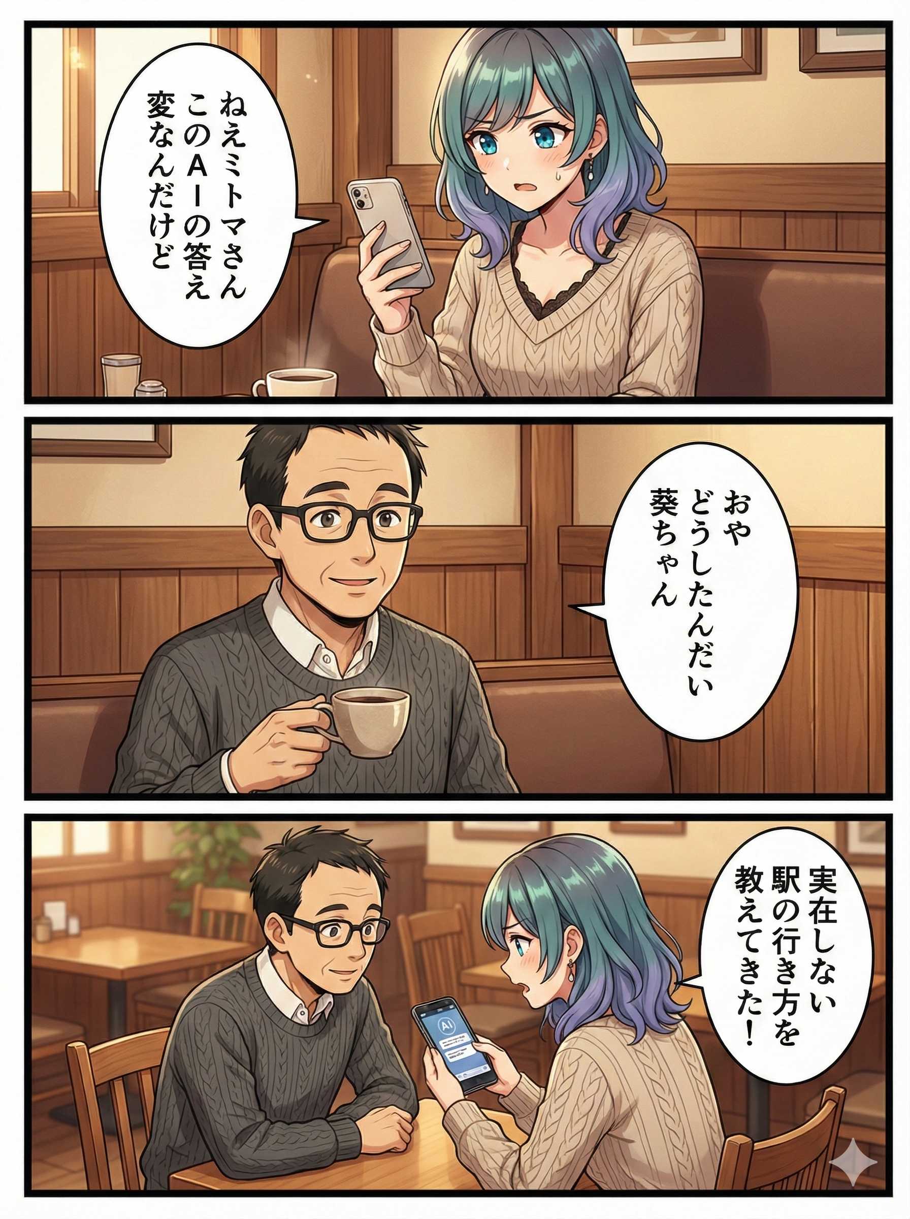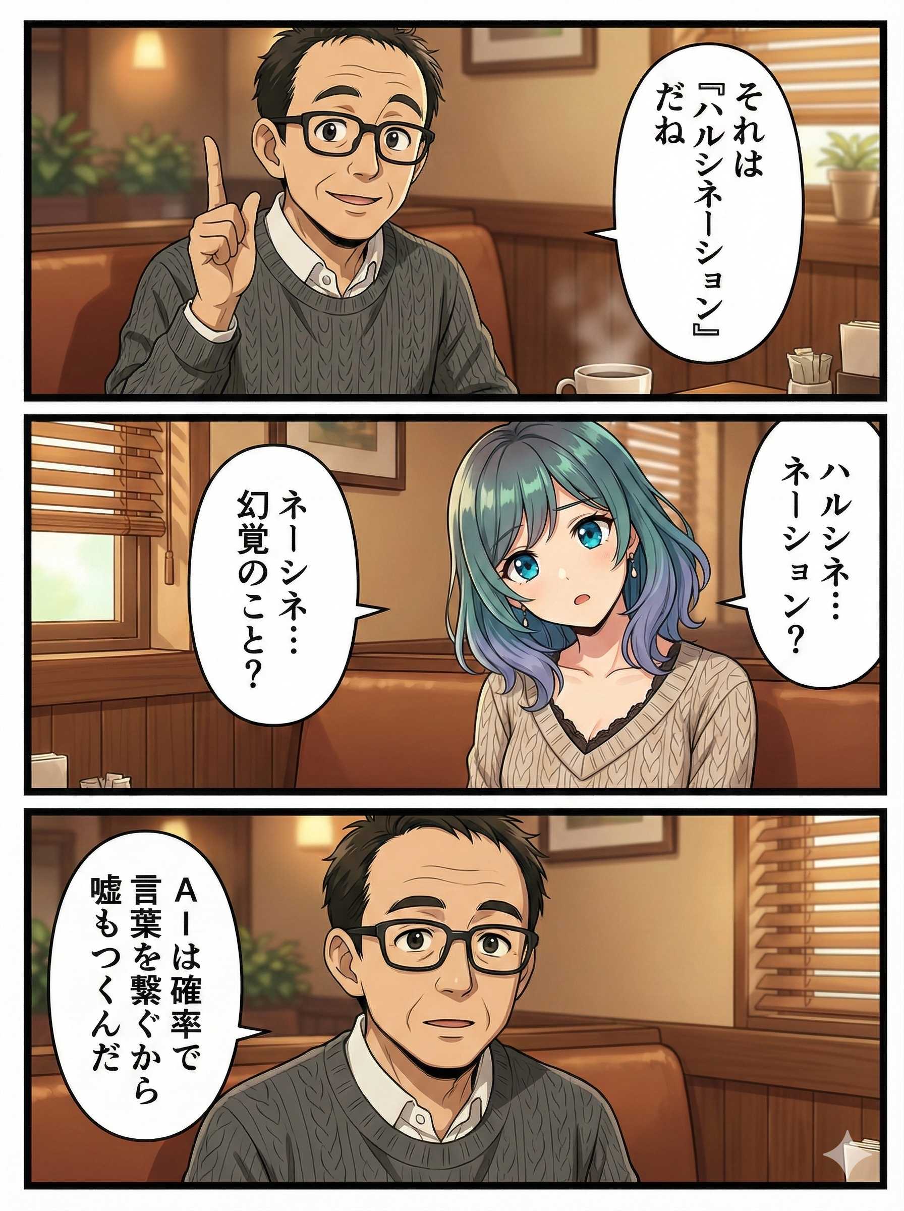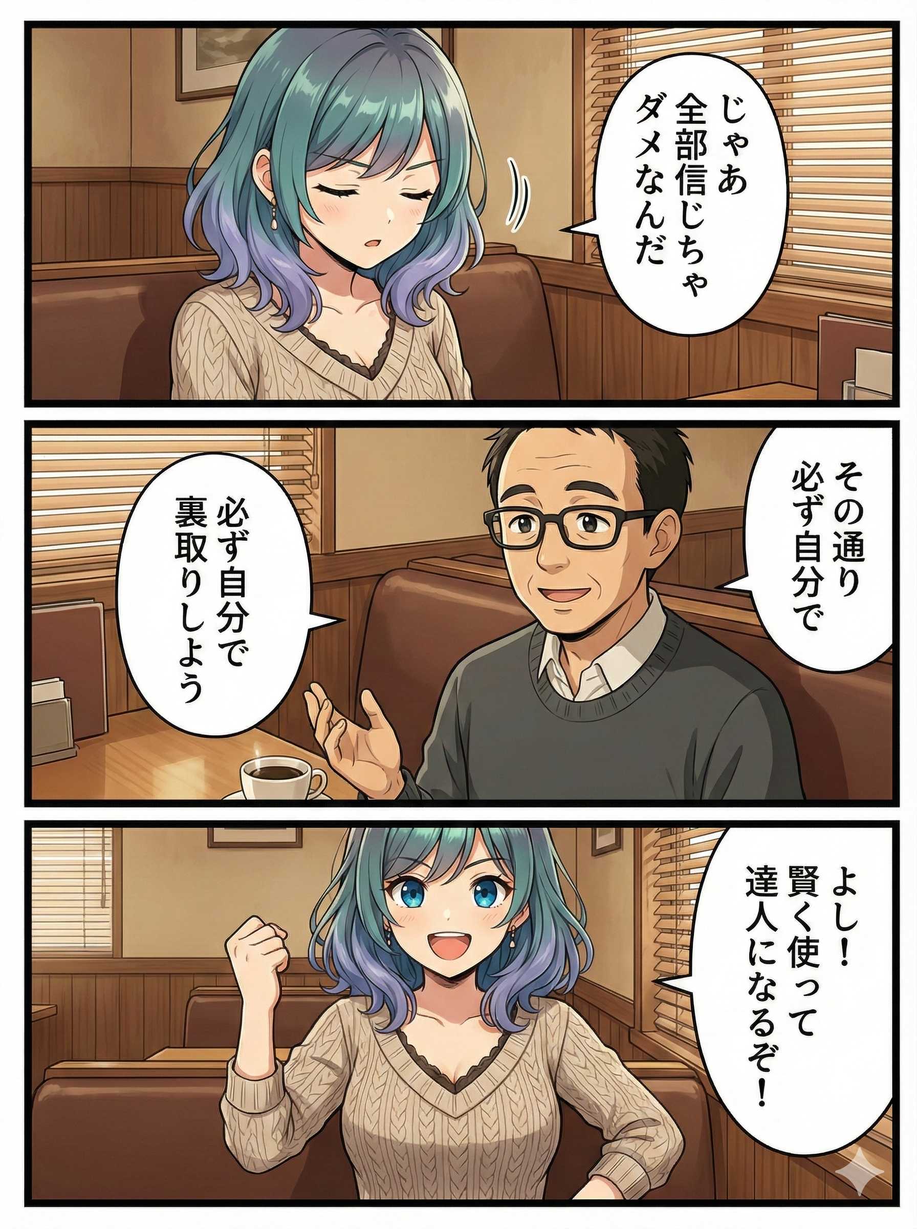 信じられないかもしれませんが、このクオリティの3ページマンガが、たった1行の指示「AIを使う際の注意点について。喫茶店で」だけで、わずか5分で完成します。慣れるまでは、もう少しかかりますが、それでも10分あればOKです。