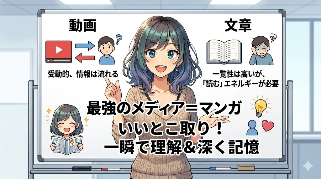 マンガは、画像を見る感覚で**「一瞬で」**内容が入ってきます(動画のメリット)。