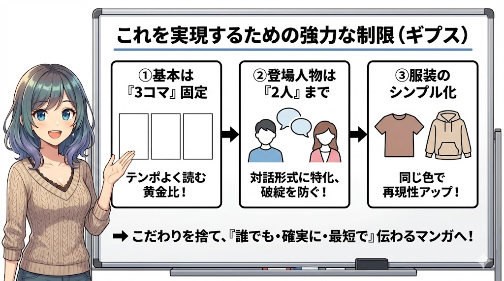 - 基本は「3コマ」固定: コマ割りの複雑さを低減しつつ、最もテンポよく読める黄金比に固定。