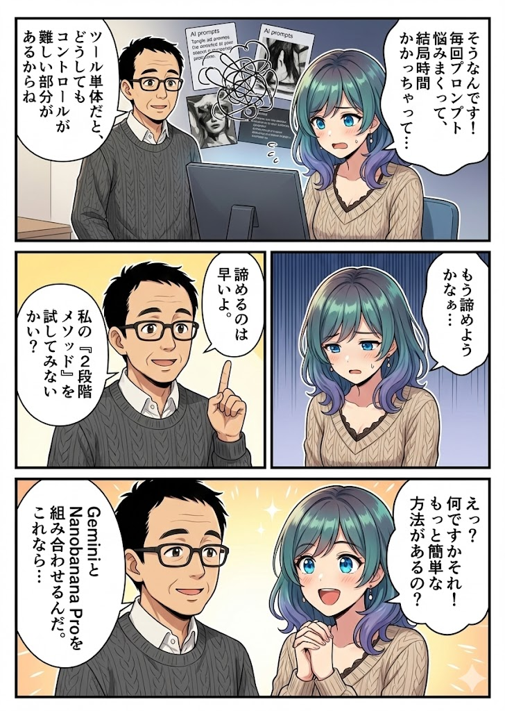 この手法は、こだわりの芸術性を切り捨てる代わりに、「誰でも・確実に・最短で」伝わるマンガを作れる未来を選びました。