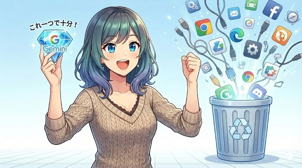 しかし、本Tipsで使うツールは**「Gemini」ただ一つ**。他の有料ツールは、解約していただいて構いません。これだけで、年間数万円のコストが浮きます。浮いたお金で、美味しい焼肉にでも行ってください。