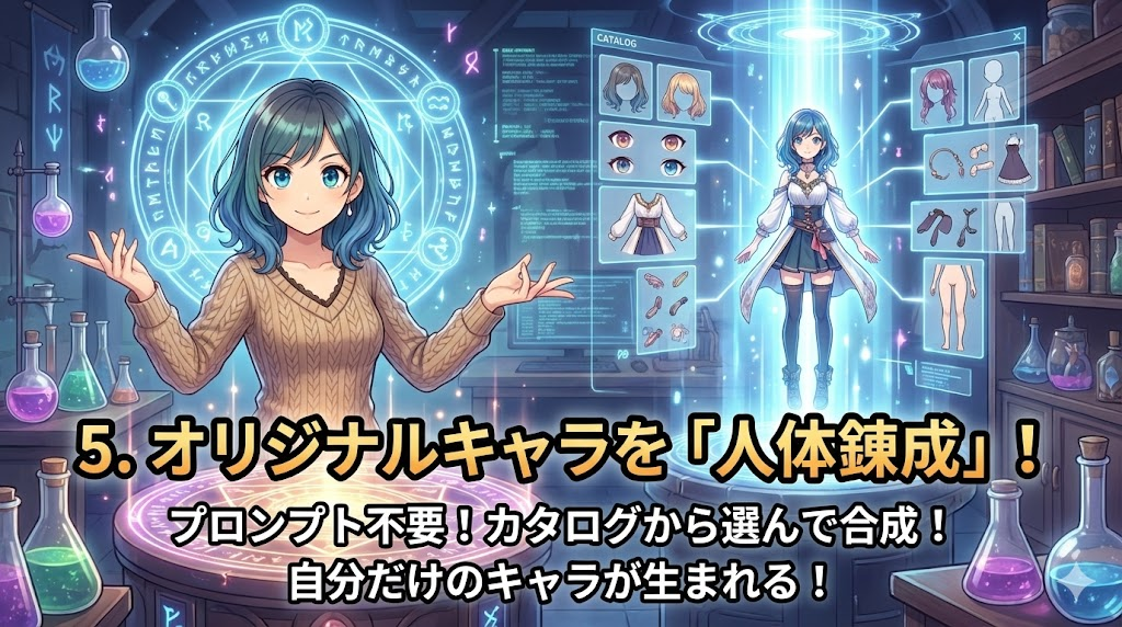 このツールを使えば、もうプロンプトで悩む必要はありません。あなたは禁忌の人体錬成を行う「錬金術師」のように、自分が求めるイメージのキャラのパーツをカタログから選び、モンタージュ写真のように合成していくだけです。
