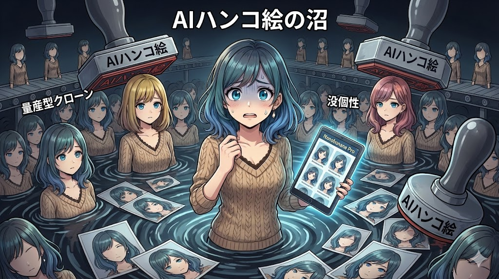 初心者がふわっとしたプロンプトを使えば、ほぼ全員が同じ「80点の正解」に収束する。これが「AIハンコ絵」の正体です。