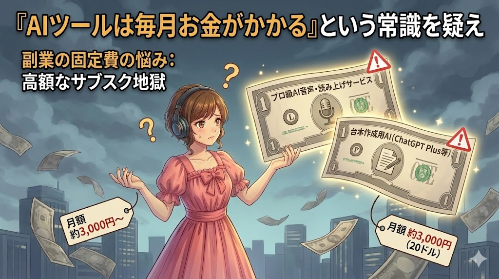 副業を志す方にとって、月々のサブスクリプション費用は避けて通れない悩みです。実際、これまでの「高品質なAI音声」や「高度な脚本作成AI」を利用しようとすると、以下のようなコストがかかるのが一般的でした。