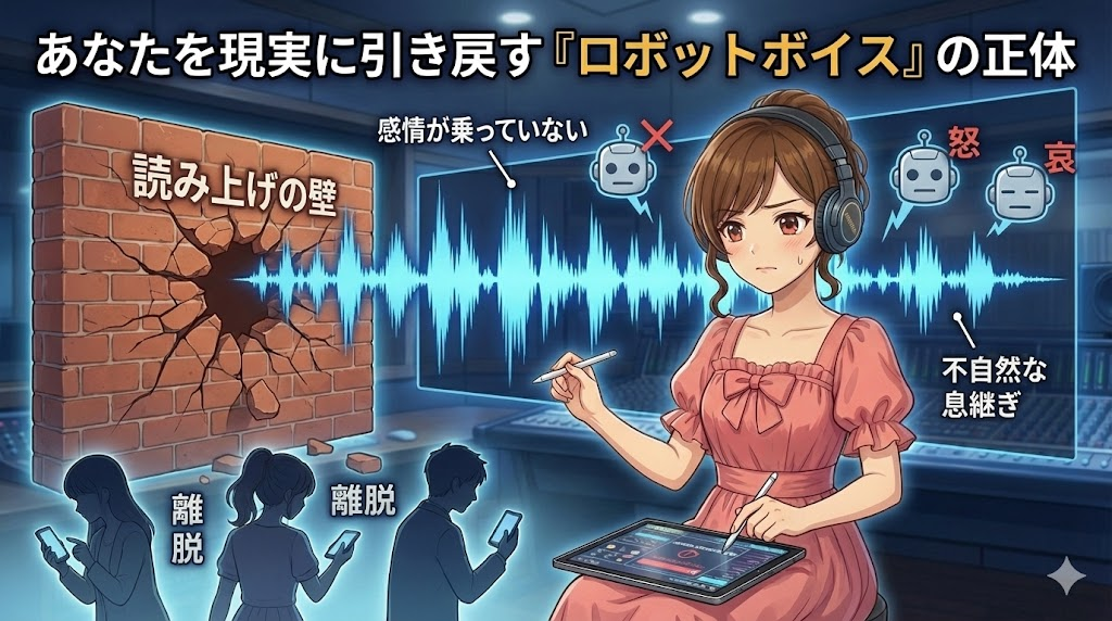 これらは、従来のソフトが文字を記号として処理し、あらかじめ録音された音を繋ぎ合わせているだけだからです。これを私は**「読み上げの壁」**と呼んでいます。読者はこの不自然さを直感的に察知し、コンテンツから離脱していきます。