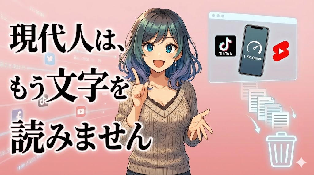 どんなに有益なノウハウを書いても、どんなに魂を込めてブログを更新しても、文字だけの情報は一瞬でスクロールされ、読まれずに流れていく。これが2026年から推測される近未来の逃れられないリアルです。