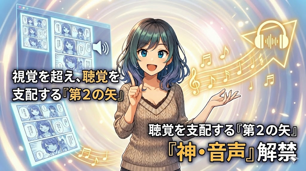 文字を読むのにはエネルギーが必要ですが、「声」は無意識のうちに脳へ流れ込んできます。 「視覚(マンガ)」に「聴覚(音声)」を掛け合わせる。 このメディアの多次元化こそが、読者の時間を独占し、圧倒的な信頼を勝ち取るための最強の武器です!