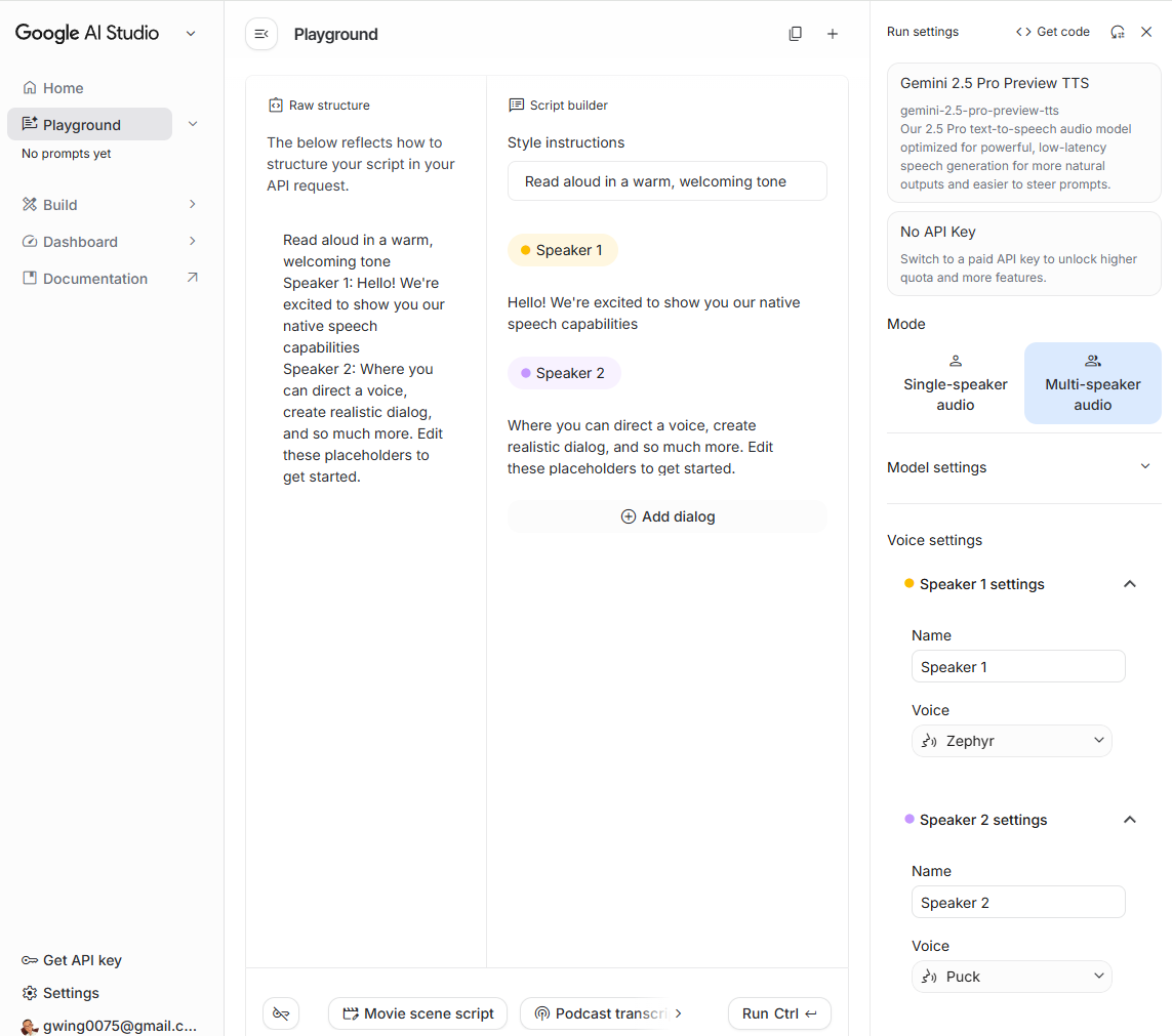 そんな失意の中にいた私の前に現れたのが、Google AI Studioでした。 最初に操作画面を見た時にはさっぱりわかりませんでした。さらに音声モデルの英語名を見て「どうせこれも海外製。日本語はカタコトだろう」と高を括っていました。