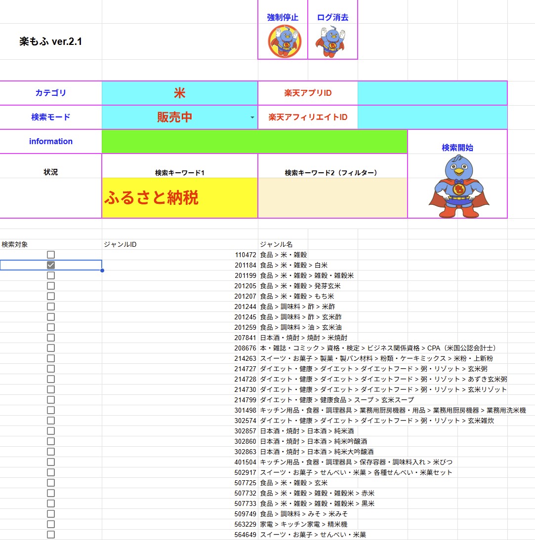 - 『楽天データ取得もふ ver.2.1』または『Amaもふ』で商品検索