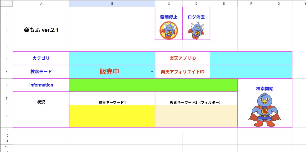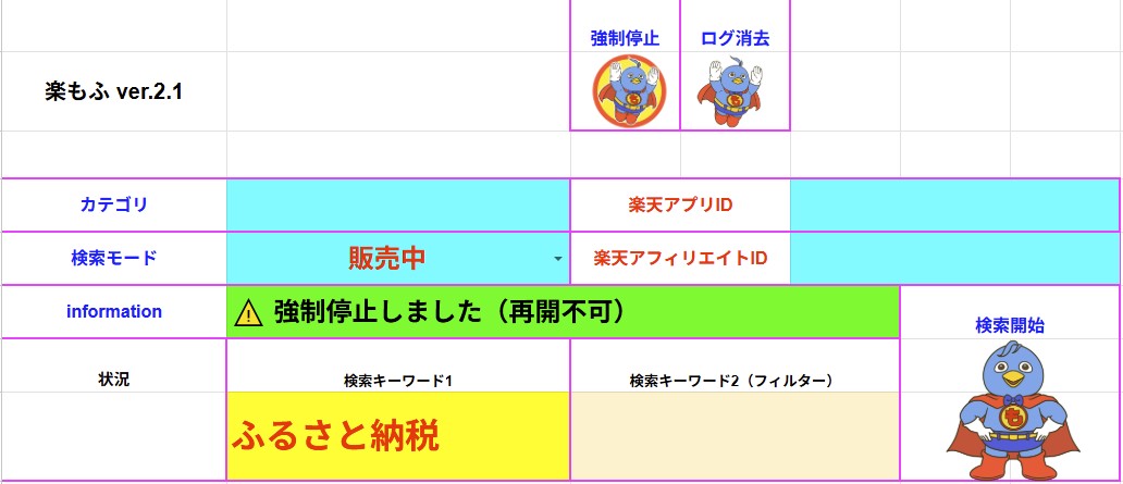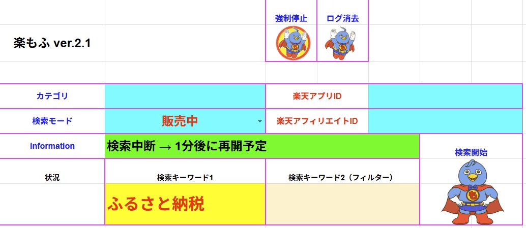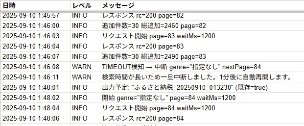 - B6セルに進行状況を常時表示 出力シート名(例:「出力シート: 検索キーワード_20250910_013230」) 自動中断/再開予定(例:「検索中断 → 1分後に再開予定」) 強制停止時はフラグを残し、誤操作を防止