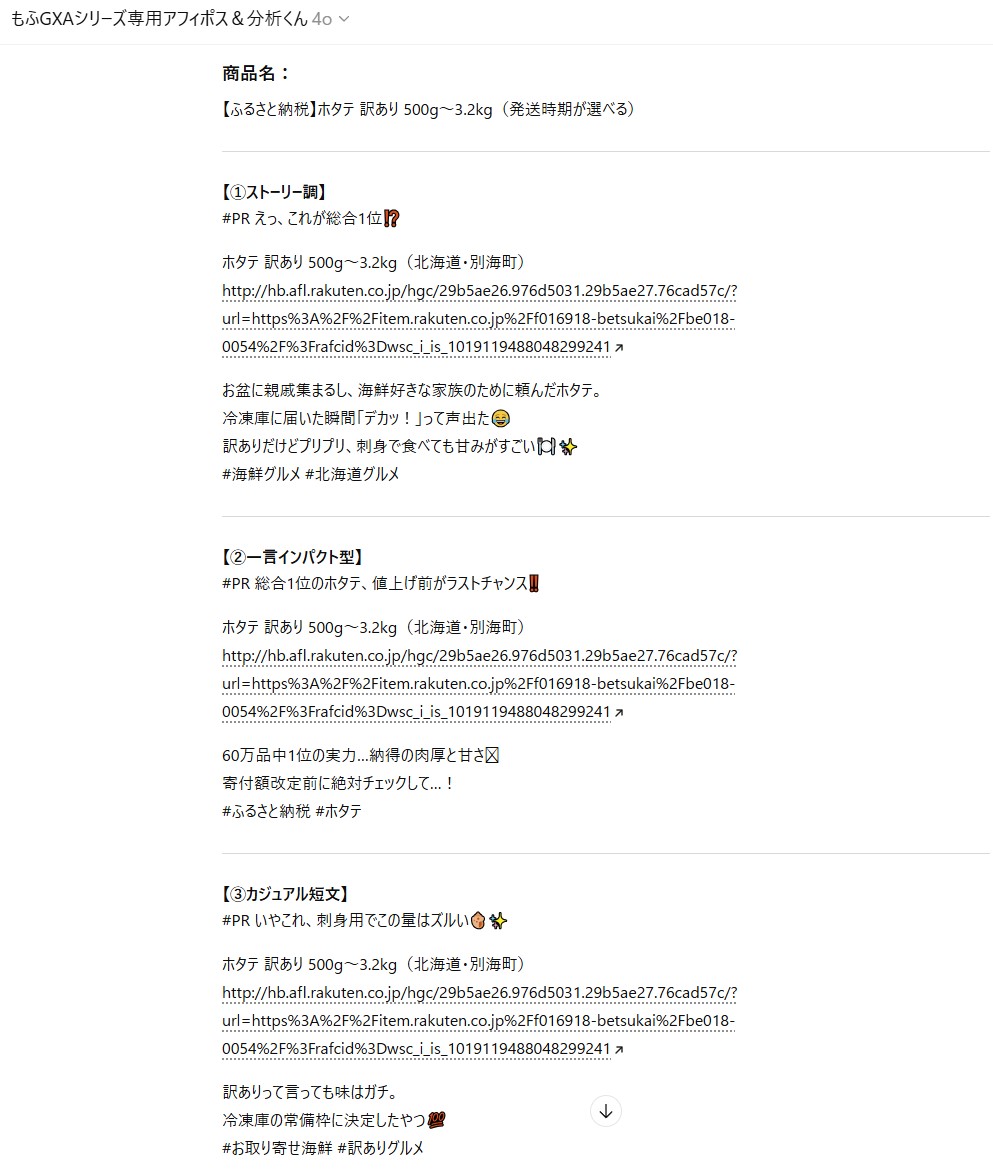 📣 商品情報を貼るだけで、X向けのポスト文を3案自動生成