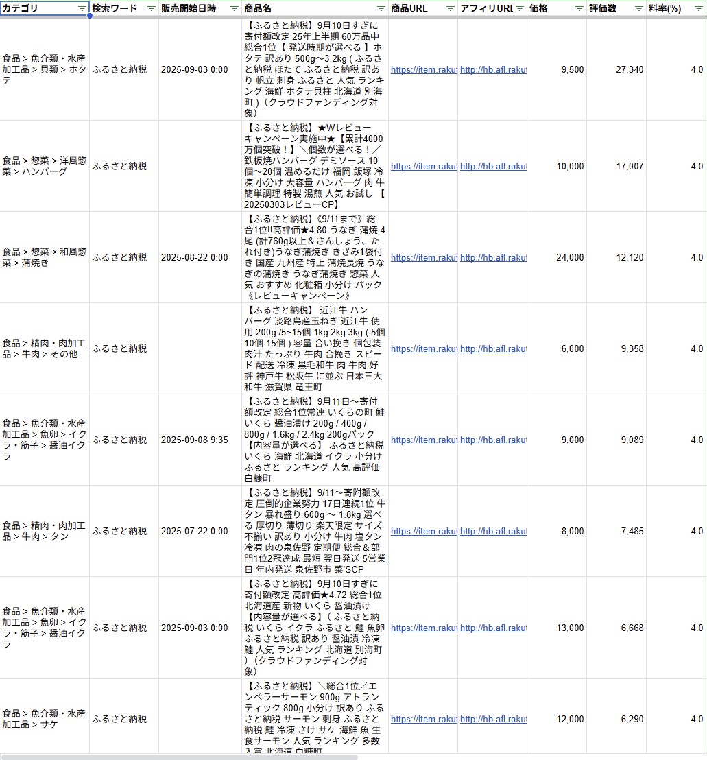 - カテゴリ/検索ワード/開始日/商品名/URL/アフィリURL/価格/レビュー数/料率を一覧化