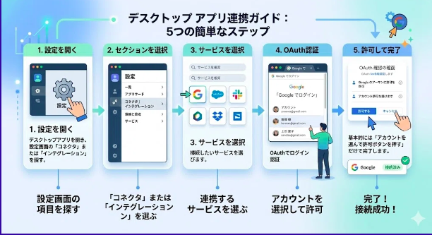 デスクトップアプリを開いて、設定画面の「コネクタ」または「インテグレーション」という項目を探します。