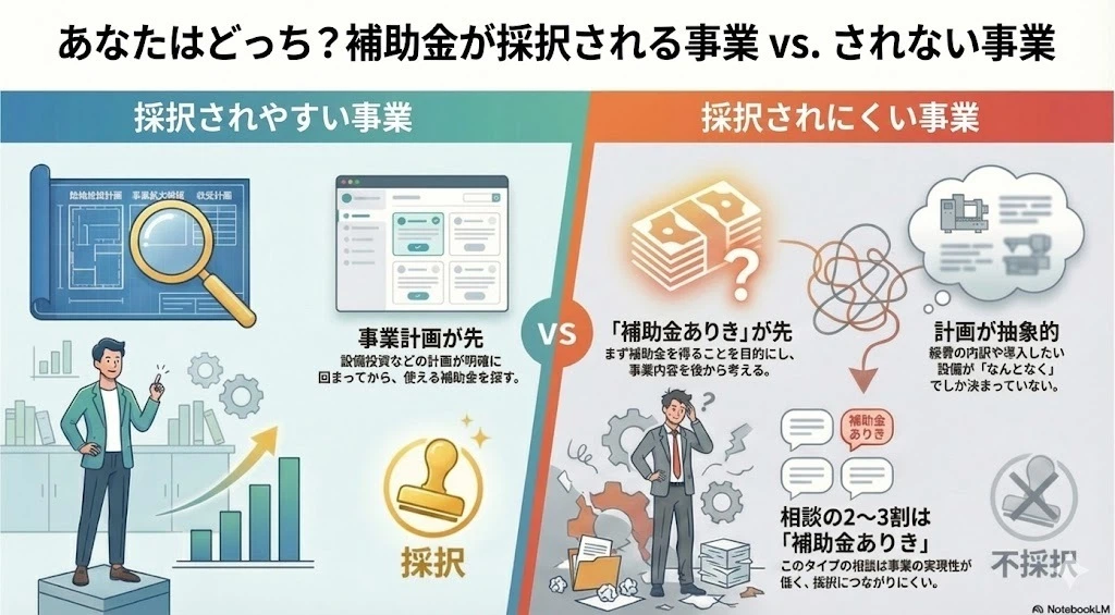 - 補助事業(経費・設備投資の内容)が抽象的で、「補助金ありき」の相談