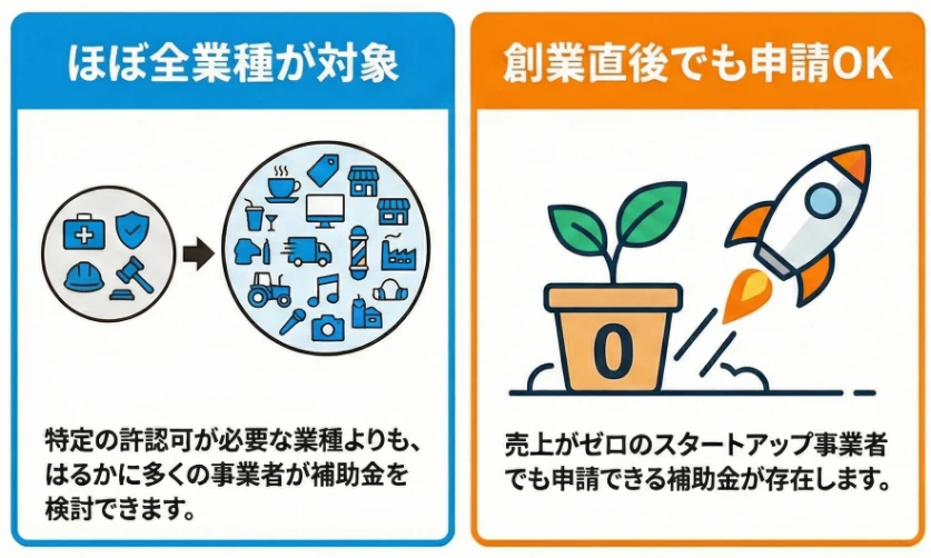 許認可や届出が必要な業種は、全体の中でもごく一部に限られます。一方で、補助金を検討できる業種はずっと広く、ほぼ全業種が対象になり得るのが特徴です。
