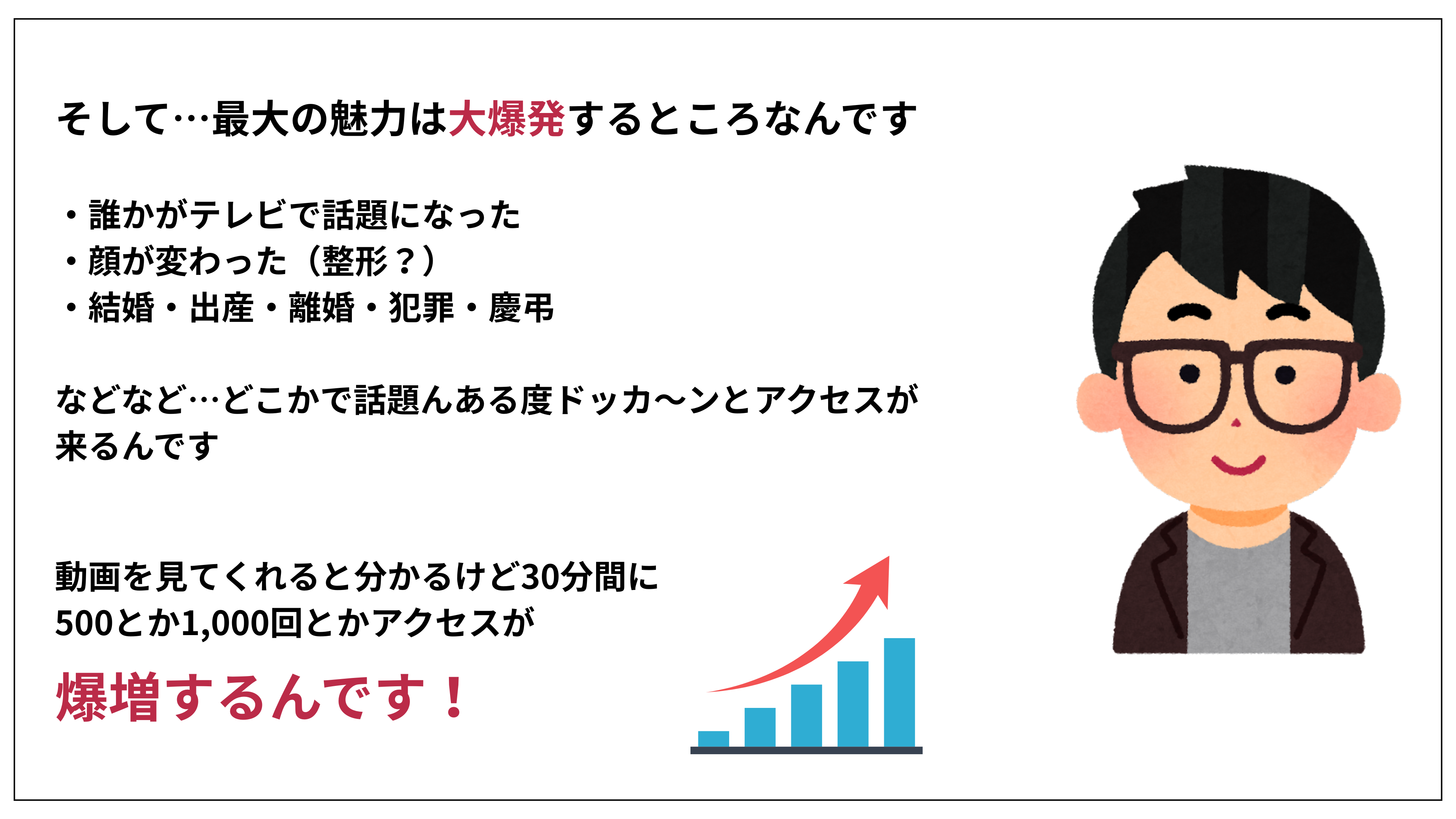 また、根記事の中からテレビに出ていた、◯◯の疑いがあるなどで、ピックアップされバズり記事が出てきます。その為にも底辺(根記事)が拡がるように記事を増やしていくことが肝心です。