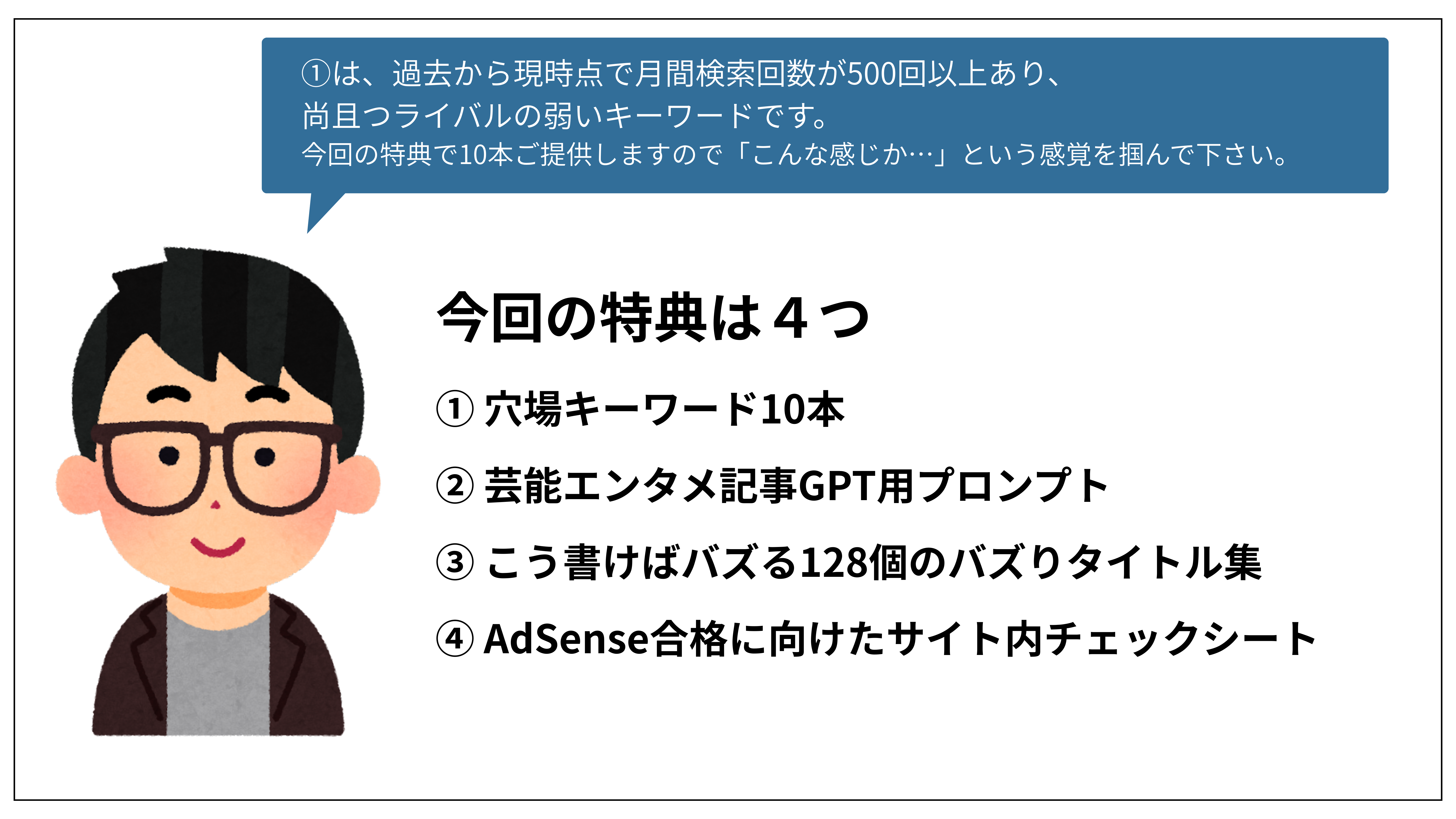 ①それほど難しく考えなくても大丈夫。AIのプロンプトがあるので、キーワードを入れるだけで、そのキーワードで記事に書くのに必要な要素は全てAIが出してくれます。