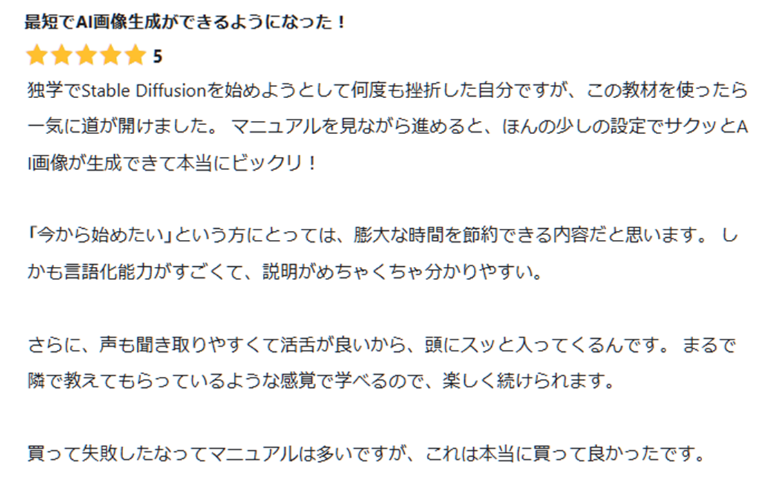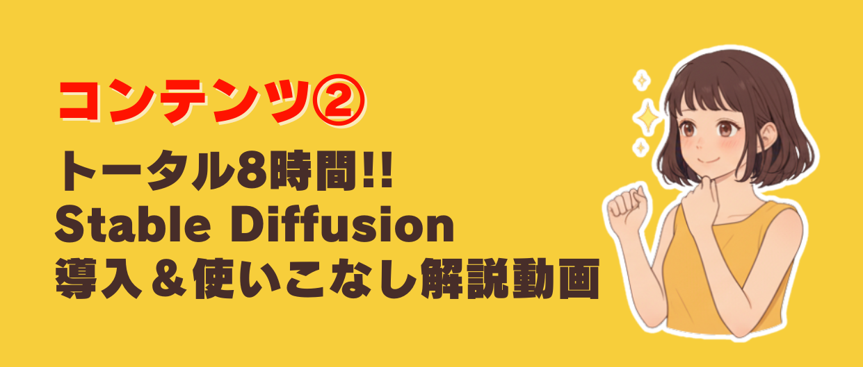 ※Stable diffusionの導入や使用法については、特典の動画講座を見て学んで頂くことを前提に作成しておりますので、テキストでの説明は最低限に留めております。
