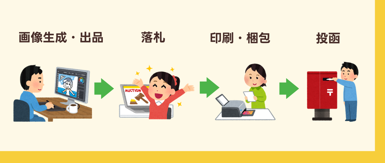 「AI美女」を画像生成AIで生成し、「ポスター」としてヤフーオークションで販売するビジネスです。