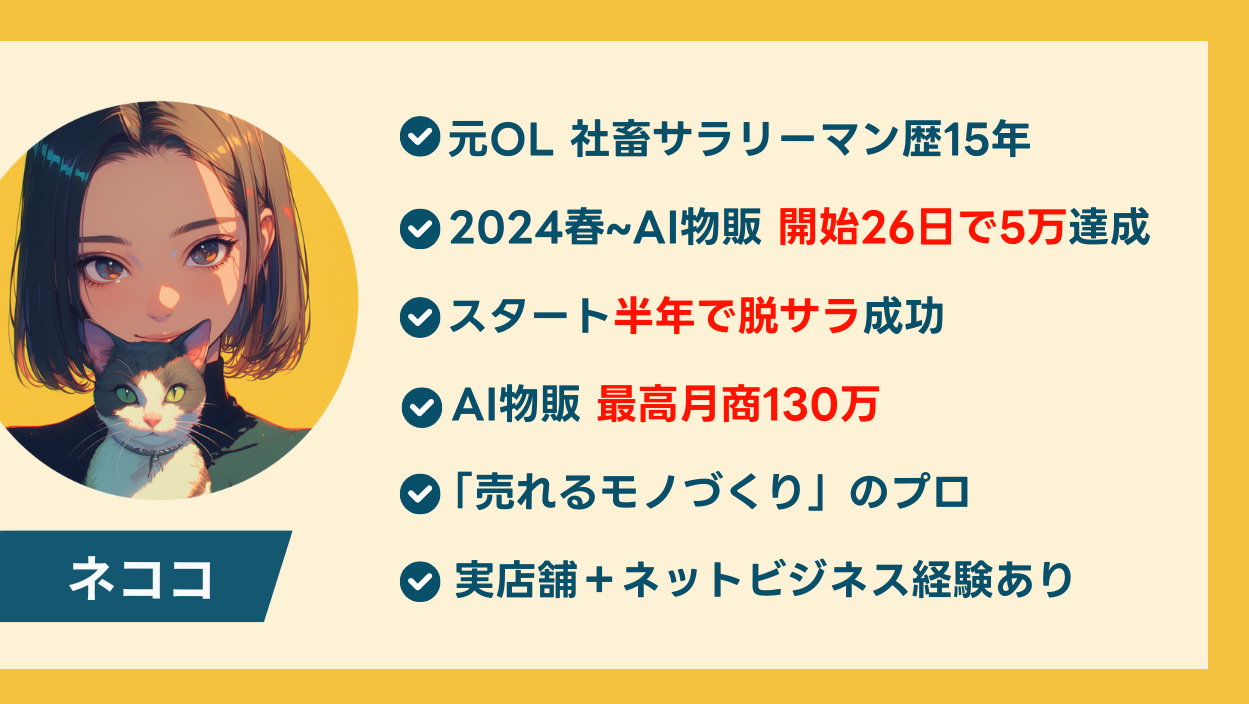 現在は、プレイヤーとして現役で運用を続け月数十万を稼ぐ傍ら、AI物販のやり方をマンツーマンで教えるネコココンサルを運営中。