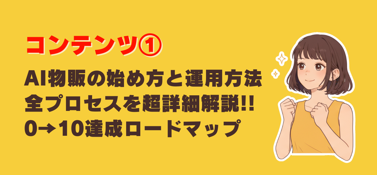 この教材では、ゼロからスタートする超初心者が「AI物販」に取り組み0→1達成することを最低目標に、その後段階的に月1万→5万→10万を狙っていくために必要なステップや考え方について、各セクションごとに解説をしていきます。