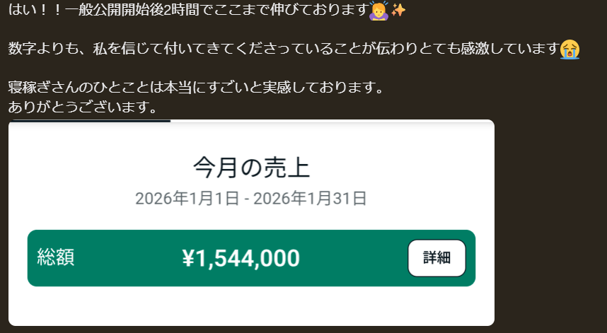寝稼ぎさんアカウントに関しては、この実績を見てもらえると