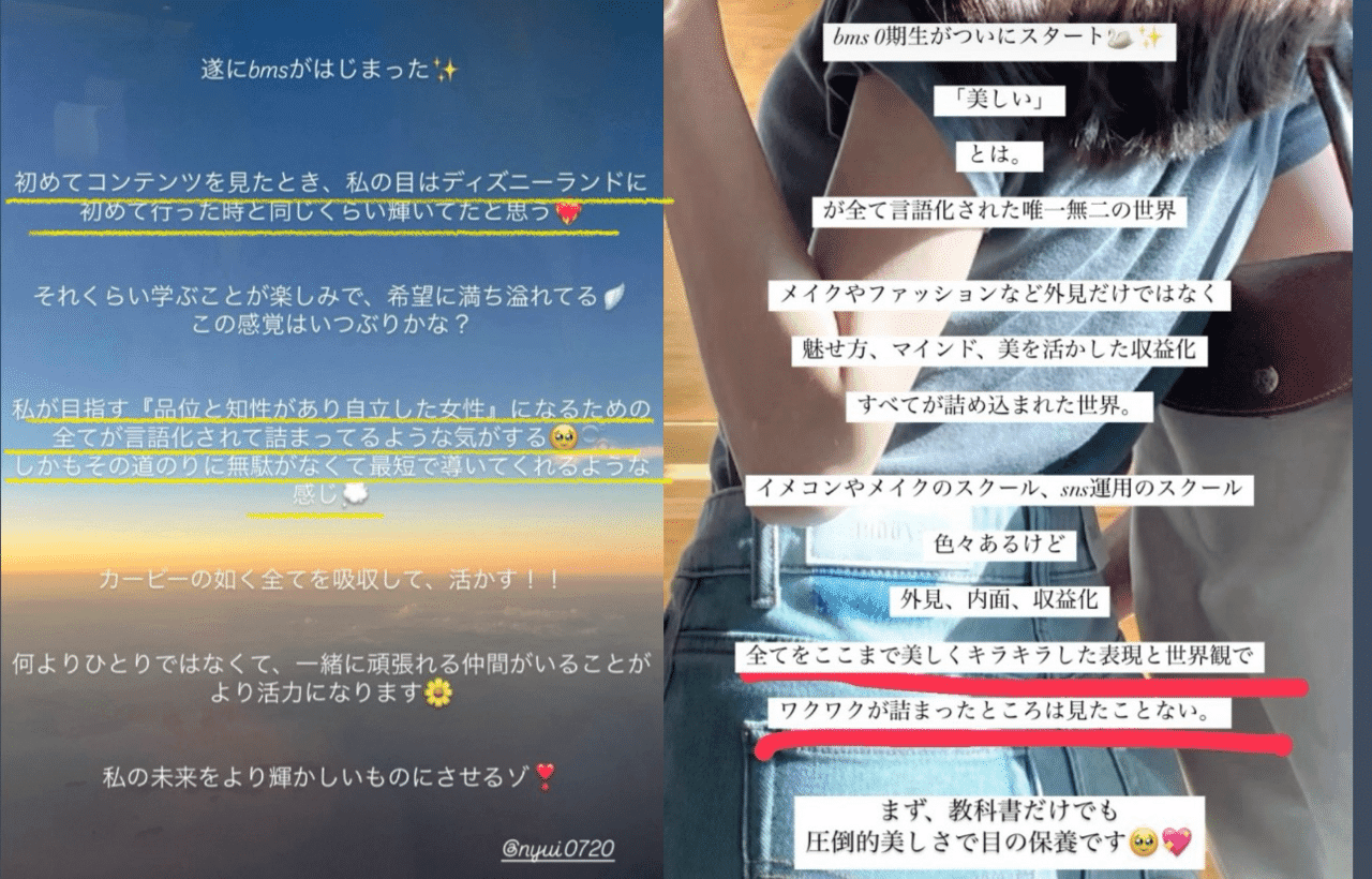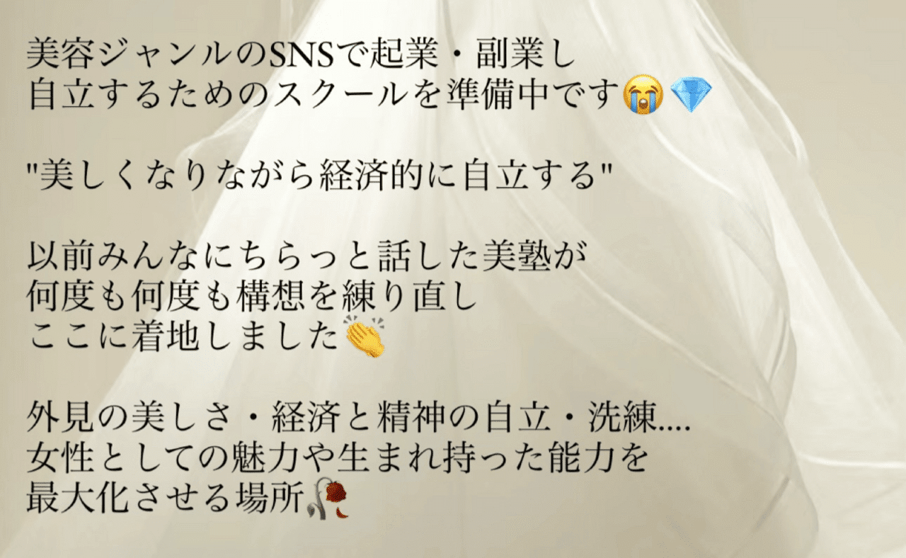 そして、現在の活動のメインはあなたのキレイが仕事になる「be女神スクール(bms)」です。前途した美容ジャンル特化型のSNSスクールです🥰