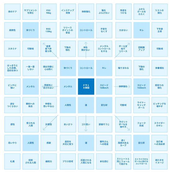 【マンダラチャートとは、目標達成のためのビジョンや行動計画を作成する際に用いられる思考・発想のフレームワークです。9×9のマス目から構成されており、中心に目標を置き、周囲に関連する要素やアイデアを書き込むことで、全体像を把握し、漠然とした思考を整理することができます。】